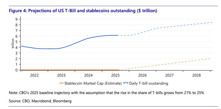 Key chart: “In theory, this implies the need for an ever-growing amount of T-Bills for the US to allow USD stablecoin-based trade to expand, just as with the current Eurodollar system – the ‘Triffin Dilemma’. Failing that, they could become akin to a deflationary gold standard (and/or trade access to the US is necessarily de facto limited).
